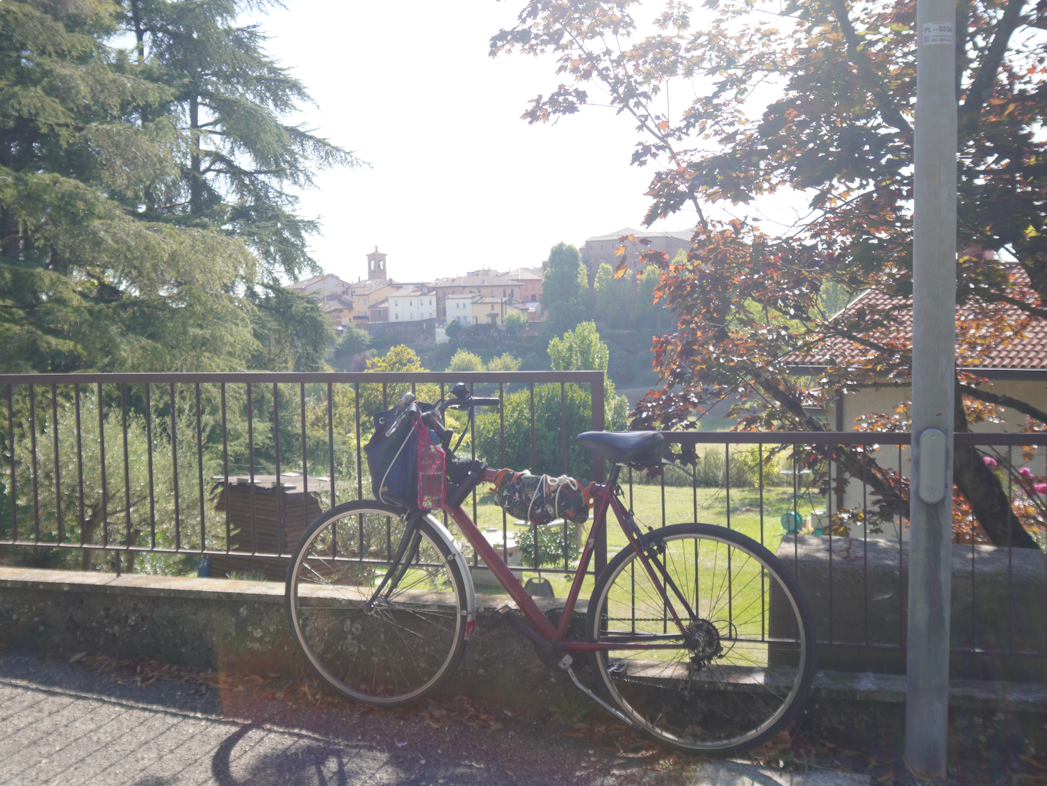 Ein paar hundert Meter nach dem Schild sehe ich auf Dozza und mache ein Bild von meinem Rad vor der Aussicht. Dann geht es noch einmal steil bergab und dann bin ich angekommen auf dem Parkplatz vor Dozza. Ich halte an einem Haus mit kleinem Pool. Wie gerne würde ich da jetzt reinspringen. Ein bisschen verschwitzt bin ich ja schon. Ich fahre auf den Parkplatz, suche mir eine unbeobachtete Ecke, und wechsel meine Hose wieder in die Leinenhose. Auch das Top kommt weg und ich schlüpfe in die weiße Bluse. Die Cracker (ab jetzt kauf ich mir eh gutes Essen) und den Scout-Beutel lasse ich verknotet am Rad hängen. Kann ruhig jemand klauen. Dann schließe ich das Rad ab und bin bereit für Dozza. Zopf, Handtasche über die Schulter und keiner sieht mir meinen Radsport an. Ein bisschen überlegen fühle ich mich.