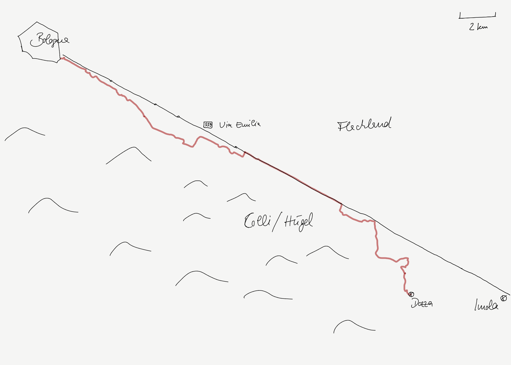 Gegen 7 Uhr starte ich mit dem Rad in Bologna Zentrum und fahre Richtung Süd-Ost aus der Stadt heraus. Es ist Anfang September, Spätsommer und mit bis zu 25 Grad zu rechnen. So früh ist es noch etwas frisch, ich trage meine lange Leinenhose über der kurzen Radlerhose und ein kleines Tuch um den Hals gebunden. Bei dem Fahrtwind ist das angenehm.