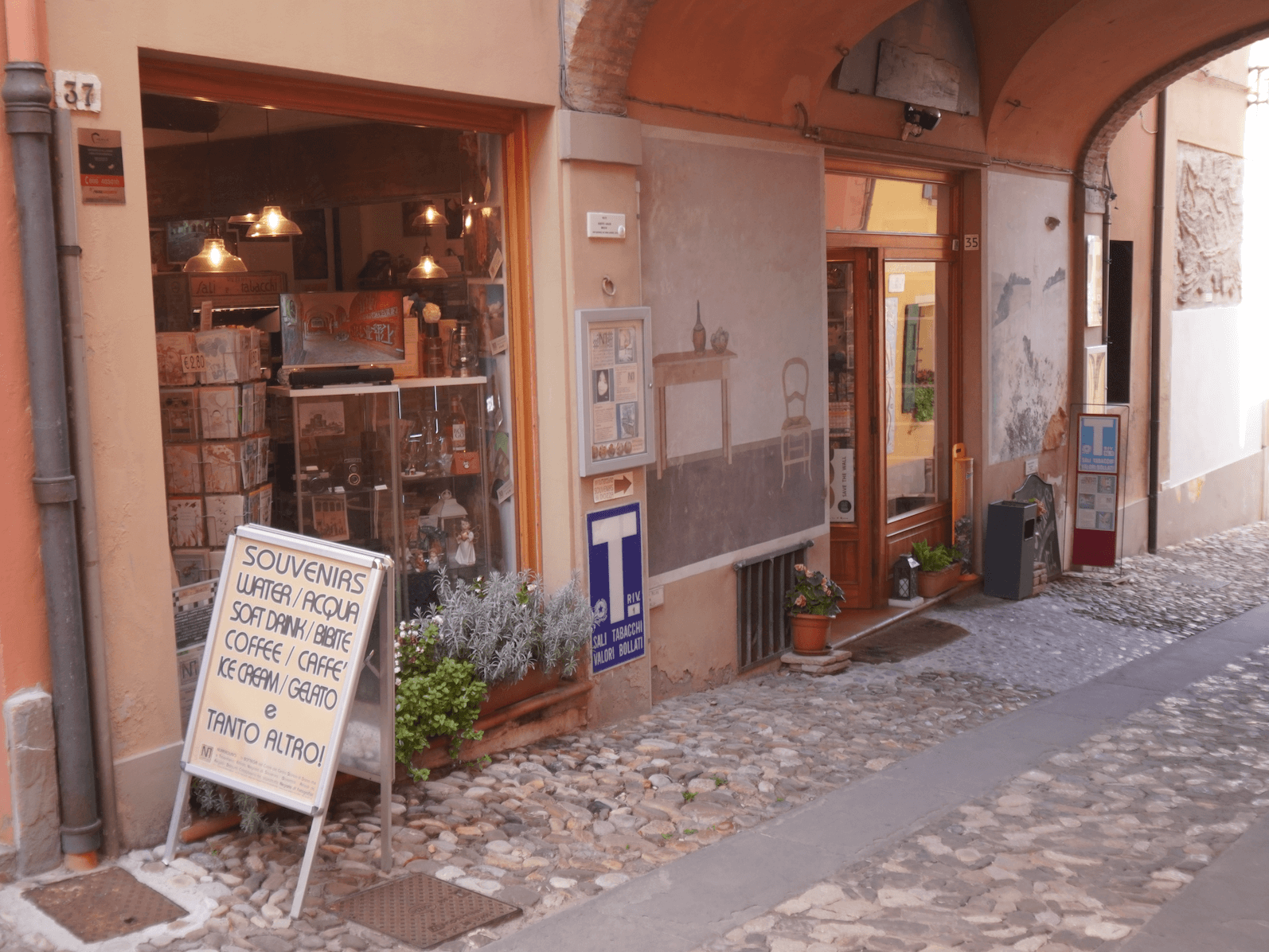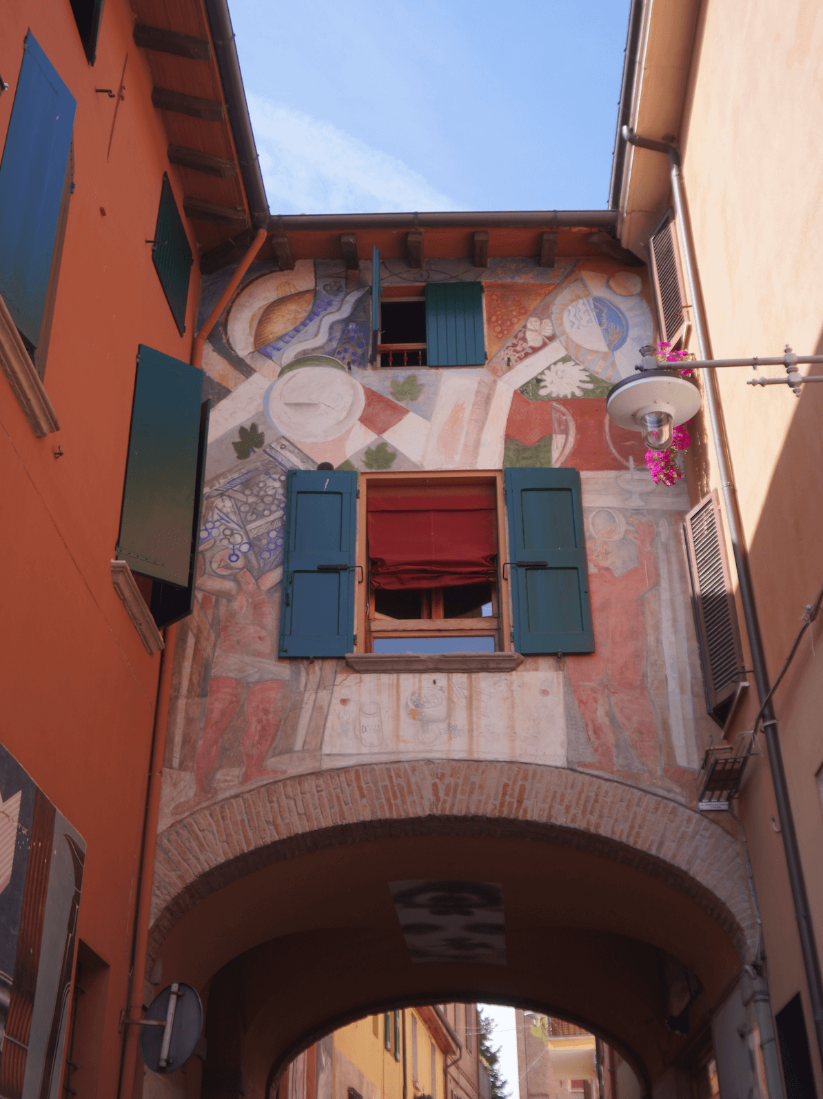 Nach der Burg spaziere ich in die erste Straße von Dozza und halte direkt an einem kleinen Souvenirladen mit Charme (12:00). Wohl strukturiert, sauber, Bücher, Kaffeetabs-Maschine und mit Edding «verzierte» «Dozza»-Feuerzeuge. Ich warte auf die nächste Gelegenheit für einen Kaffee. In der Straße sehe ich die ersten Wandmalereien, für die Dozza bekannt ist.