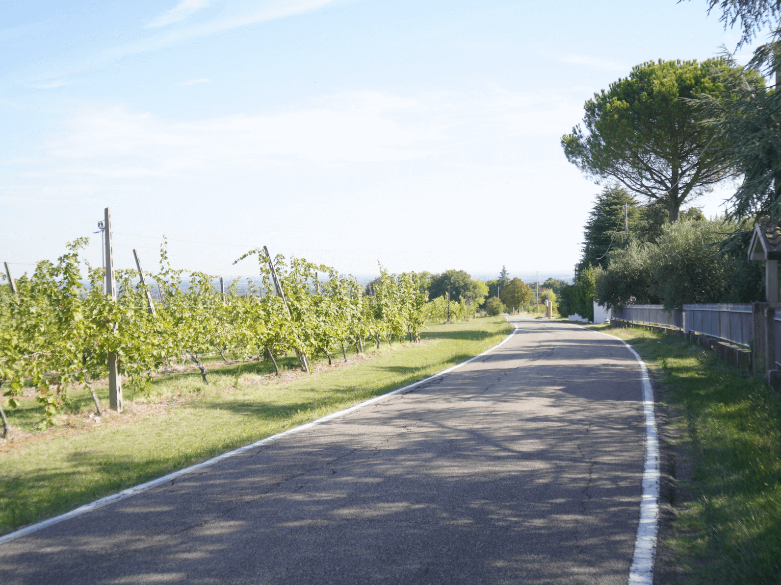 Ich halte noch einmal für ein Foto (08:38), einen Schluck Wasser und creme mein Gesicht ein. Auch der Moment für Cappie und Sonnenbrille ist gekommen, weil ich der Morgensonne entgegen fahre. Maps führt mich grundsätzlich an der SS9 Via Emilia entlang und wo es geht über Nebenwege und Straßen. Einmal geht es auch über einen recht groben Schotterweg, der meinem Stadtrad so garnicht gut tut, aber es geht. Und dann fahre ich einfach und fahre.