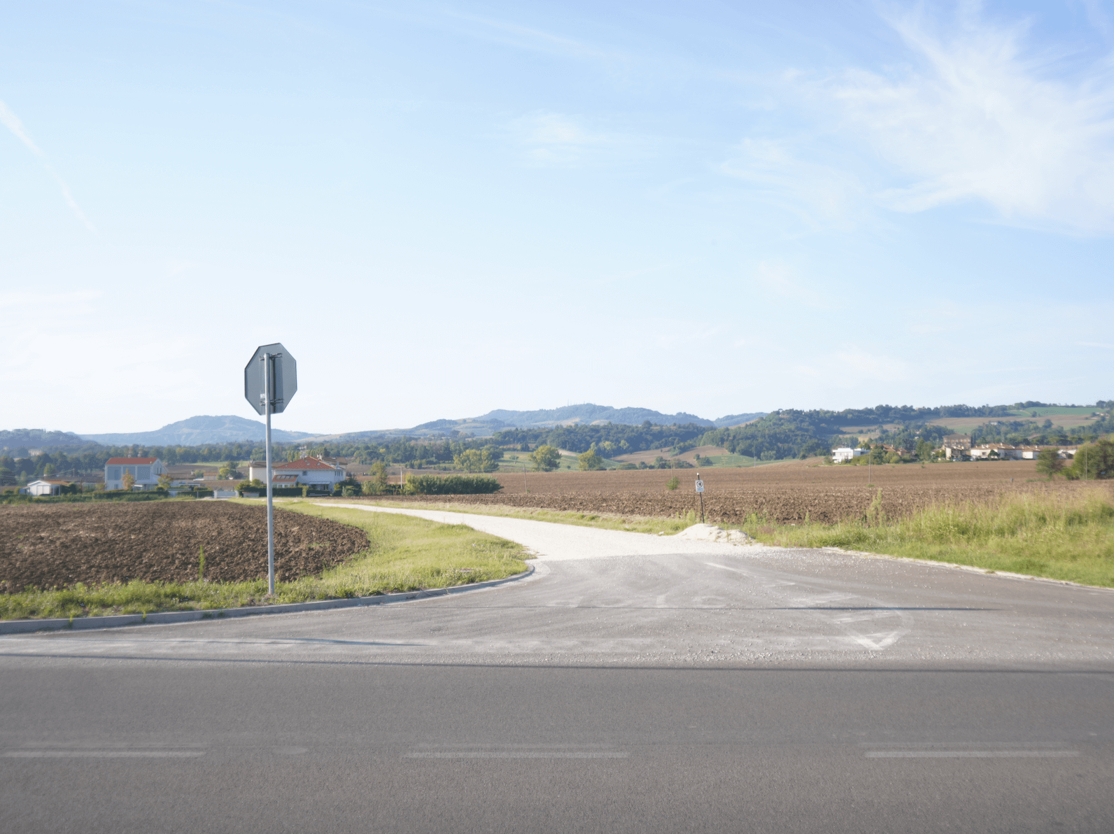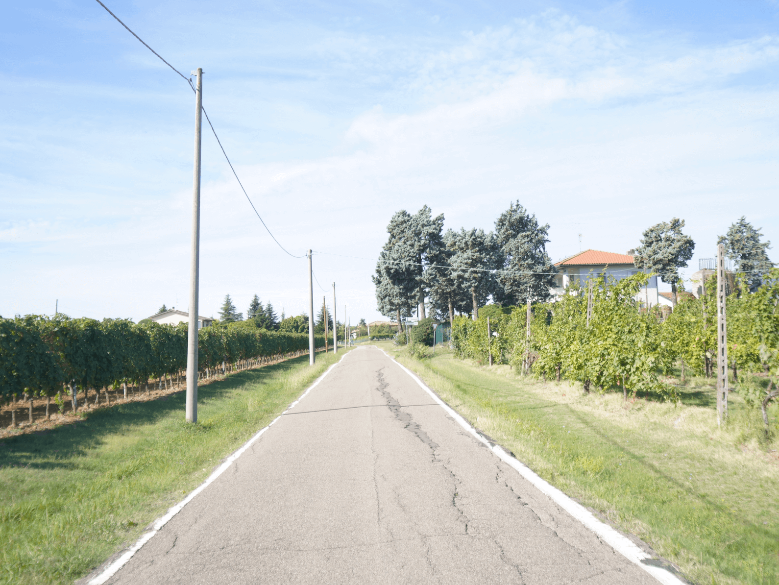 Dann geht es wieder für ein Stück auf der Via Emilia für mich weiter. Eine schnurgerade Schnellstraße. Etwas gefährlich, weil die Autos manchmal etwas nah an mir fahren, aber man kommt dafür auch schnell voran. Um 09:49 erreiche ich das Kreiseingangsschild von Dozza. Und bald darauf geht es dann für immer weg von der Haupstraße nach rechts ab in ein Wohngebiet (09:57), dann noch etwas Industrie. Hier geht es immer mehr bergauf.
