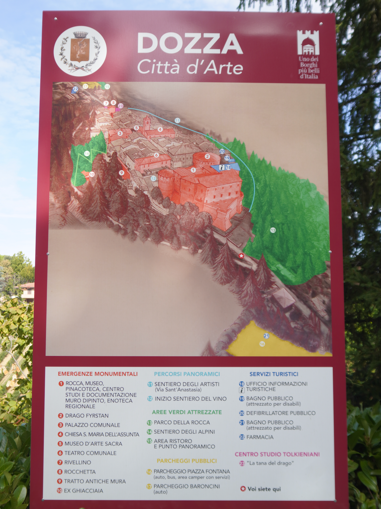 Um 10:45 schreite ich durch die Tore Dozzas. Vorher links noch eine interessante Infotafel mit Stadtplan, den ich mir abfotografiere. Auf Papier existiert tatsächlich nichts in der Qualität, nicht mal im Touristenbüro.