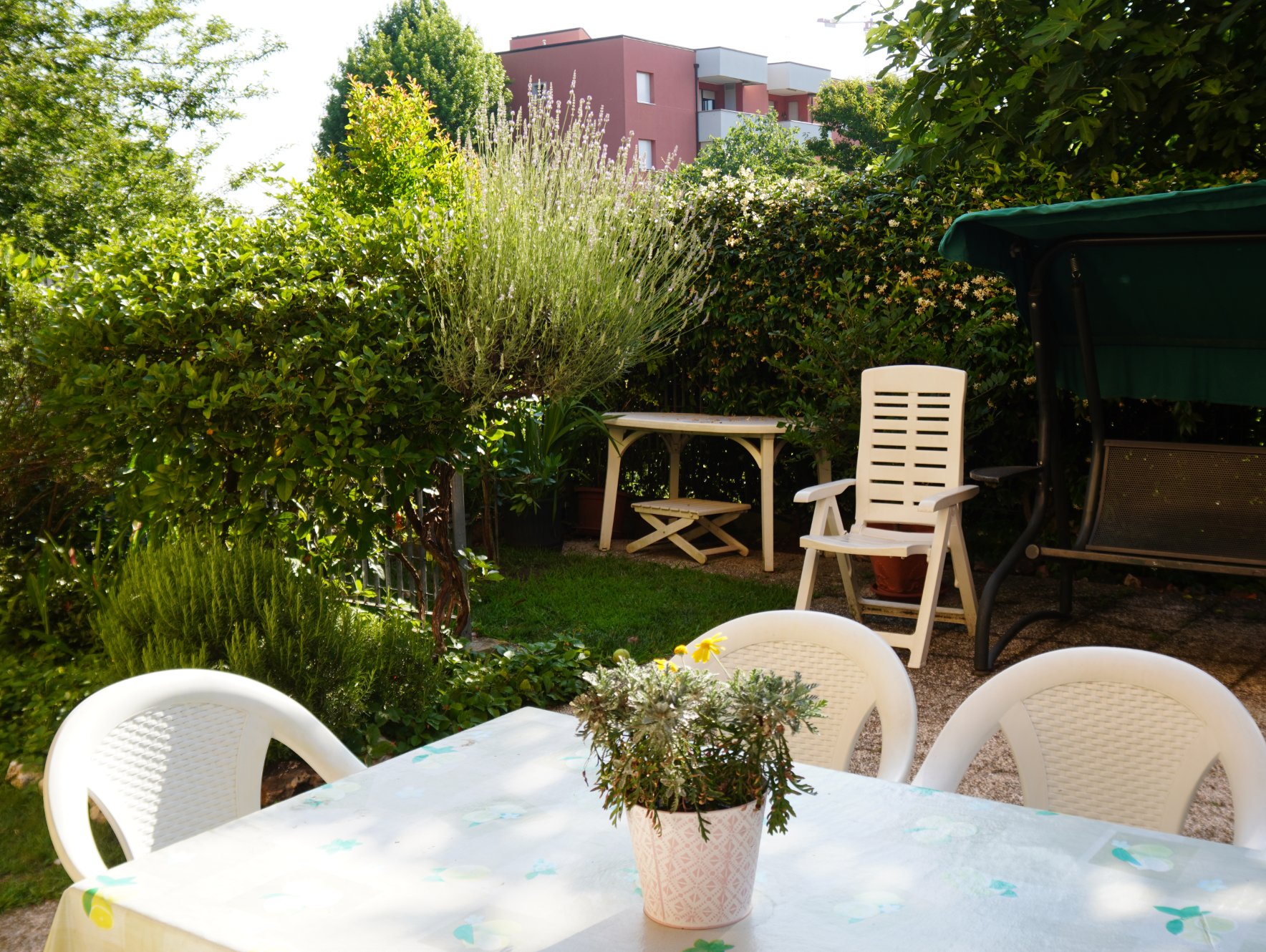 Bis sieben Uhr abends sitzen wir da. Dann zeigt Graziella mir noch genauer den Garten. Die neuen großen Bäume, ein Feigenbaum, der sich auf der rechten Seite groß gemacht hat und links eine Hainbuche. Beides kleine Gewächse die sich durch das Umpflanzen vom Topf in die Erde kraftvoll ausgebreitet haben und nun Schatten spenden. Hinterm Haus ist eine kleine Ecke mit einem Stuhl zwischen ein paar Büschen. Hier, sagt Graziella, setzt sie sich manchmal zum Lesen hin und fühlt sich dann wie in den Bergen. Ich glaube, als Kind und mit ihren Eltern waren die Gandolfos oft in den Bergen und im Wald zum spielen.